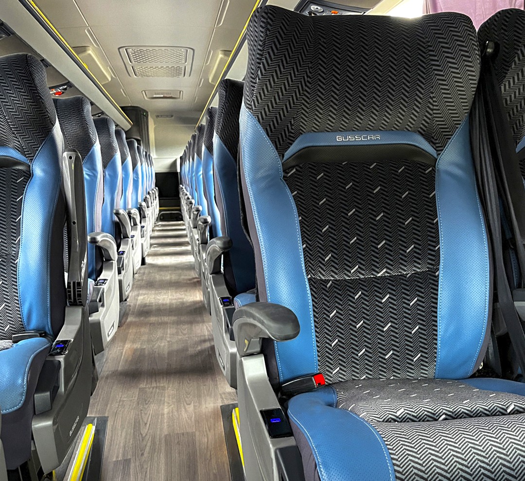 O salão de passageiros oferece 46 poltronas Superpullman, combinando ergonomia e praticidade. Os assentos contam com apoio de braço escamoteável junto ao corredor, apoio de pés com balancim, cintos de segurança abdominais retráteis, porta-revistas tipo rede, porta-copos individuais e identificação numérica em acrílico. Cada passageiro também tem à disposição uma tomada USB-A Smart individual, reforçando a conectividade durante a viagem.