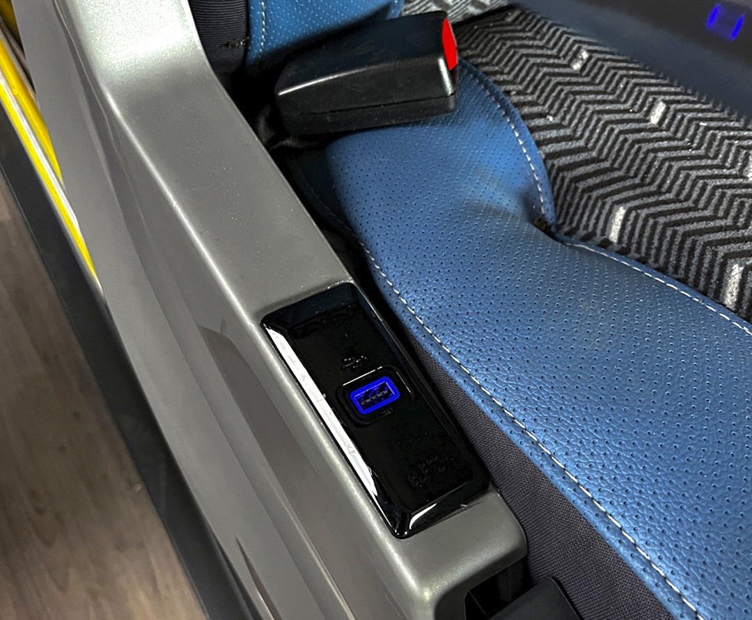 A acessibilidade é outro ponto alto. Oferece elevador para cadeirantes, dois assentos reservados com identificação tátil e cintos de segurança de três pontos. O sistema de solicitação de parada ou assistência inclui teclas nos pontos preferenciais e junto ao elevador, com sinalização sonora e visual direcionada ao motorista.