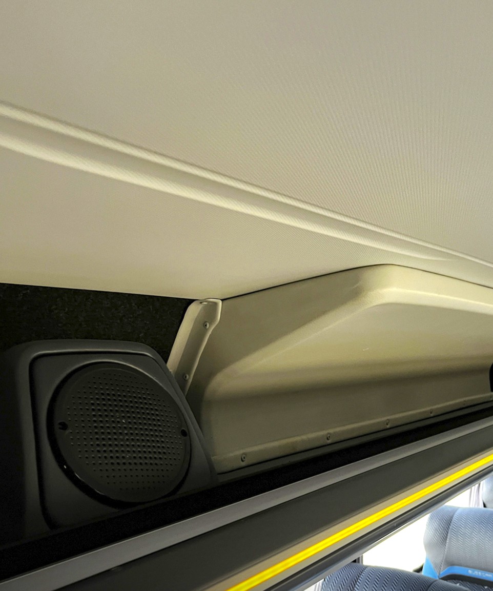 Detalhes como iluminação lateral, botão de campainha no porta-pacotes e soluções integradas de organização reforçam o cuidado da Busscar em cada aspecto do projeto.