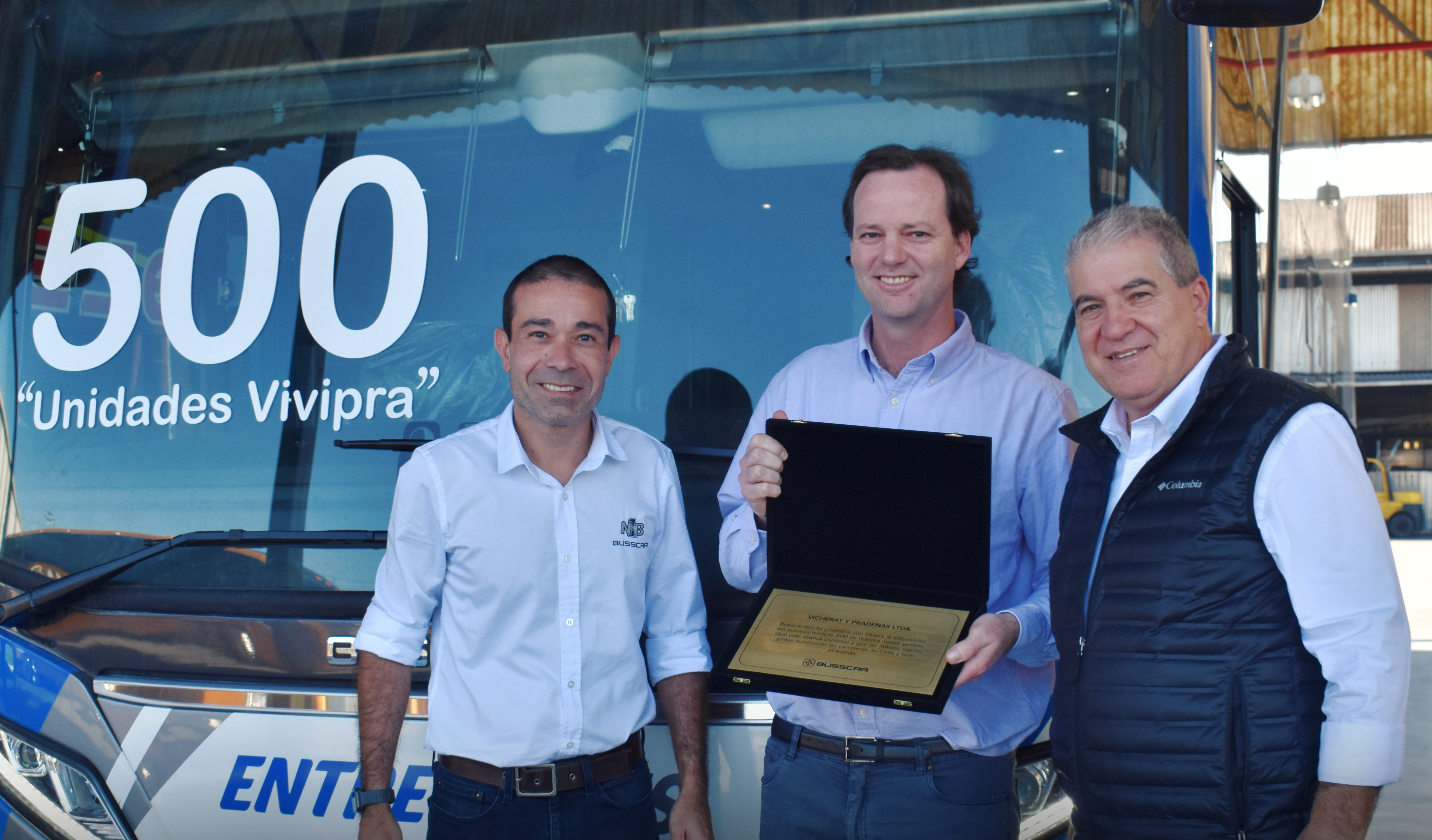 A Busscar comemora este mês a entrega do ônibus número 500 para o Chile. Acaba de ser entregue a unidade para a Vivipra – Vicherat y Pradenas, empresa que representa a Busscar naquele país. Para a ocasião ocorreu uma solenidade em Joinville, SC.