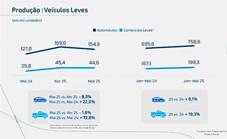 Assim, as vendas de pesados em maio caíram 4,2% em relação a maio de 2024 e, no acumulado do trimestre decresceram 1,2%. A boa surpresa ficou com as picapes de até 3,5 toneladas que cresceram 72,8% no mês e 19,3% no trimestre.