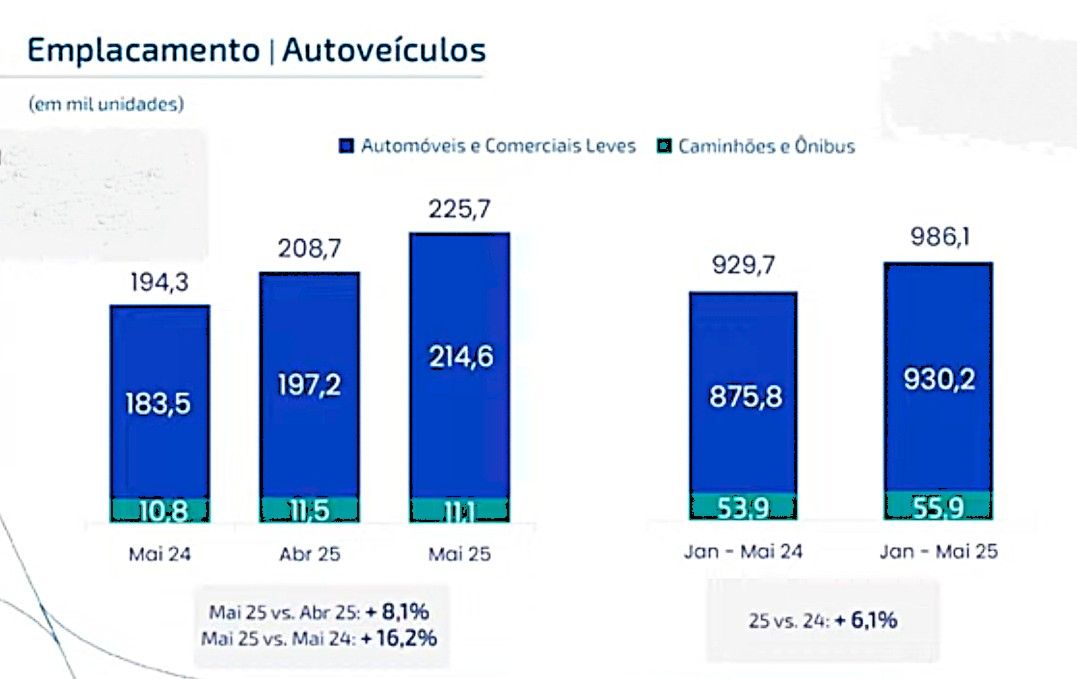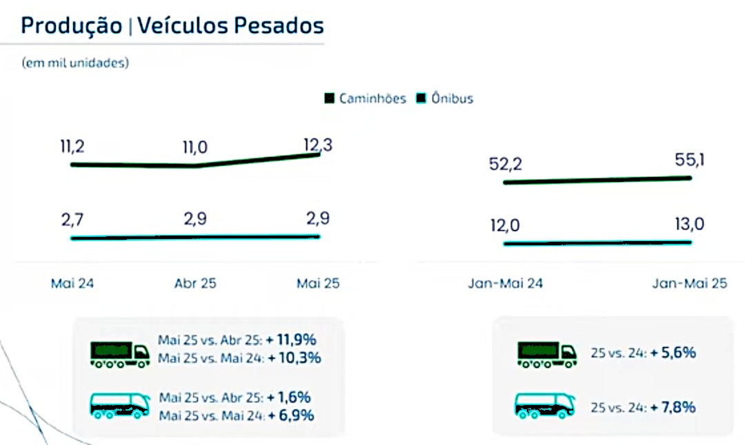 Já o segmento de ônibus mostrou sua força. No mês de maio, a evolução sobre o mesmo mês do ano passado chegou a 51,4%, enquanto no acumulado do trimestre o crescimento de emplacamentos alcançou 35,8%.
