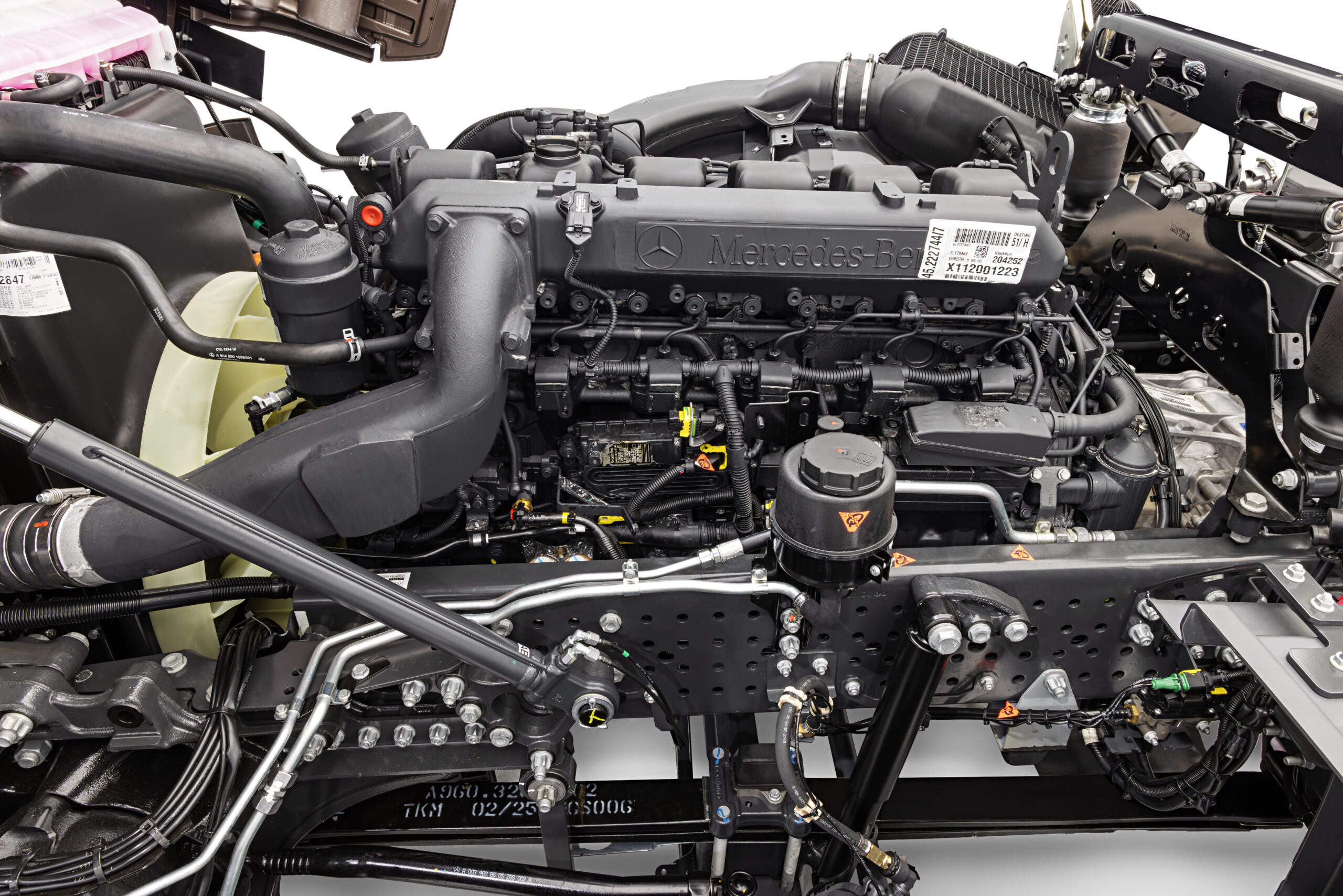 O novo Axor retorna com o motor OM 460 LA, que desenvolve torque máximo de 2.200 Nm (449 cv) e 1.900 Nm (381 cv) e oferece CMT de 62 t nas configurações 4×2 e 6×2, além da versão com redução nos cubos que chega a 68t.