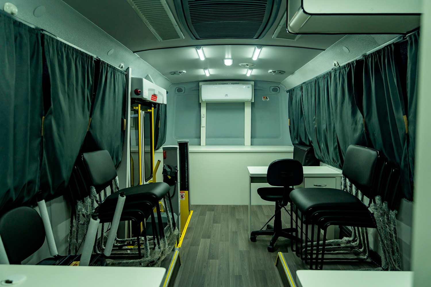 Com 10.145 metros de comprimento, os veículos são equipados com sistema de ar-condicionado no porta-pacotes, kit strobos de sinalização visual, sirene, megafone, sistema de áudio e vídeo com telas de DVD, além de tomadas 110V e 220V distribuídas em cinco pontos no interior do veículo.